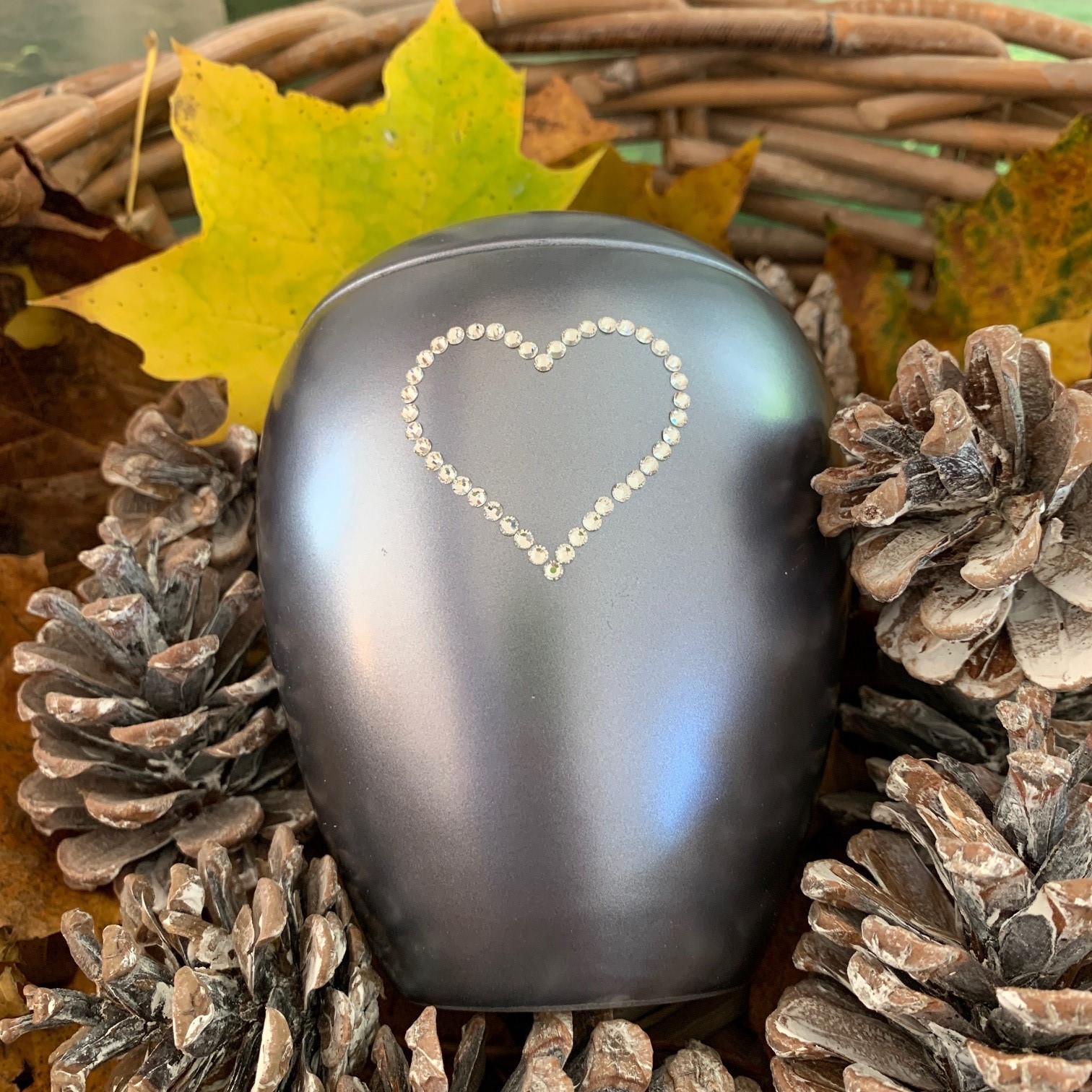 Die Keramikurnen der "Edition Crystal" besitzen eine perlmuttschillernde Oberfläche. Sie sind verziert mit einem Herz aus hochwertigen Kristallen, die in liebevoller Handarbeit einzeln aufgebracht werden.